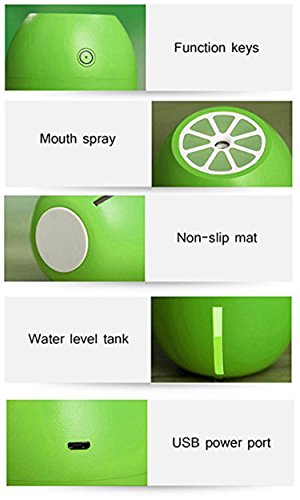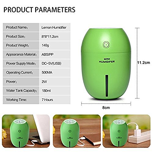 -Brand: BIOSTON -Material: PP, ABS -Input voltage: DC 5V -Current: 500mA -Power: 2W -Misting output: 30ml/hr -Working time(max): 7H -Auto power-off: yes -Tank capacity: 180ml -Dimensions: length 3.1'(8cm); width 3.1'(8cm); height 4.4'(11.2cm) -Color: yellow/blue/green/orange -Weight: 5.1oz(145g) PACKAGE INCLUDING: