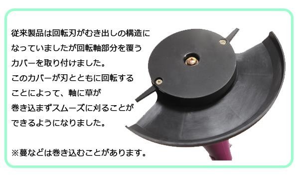 | 刈り取った草の巻き込み防止構造でスムーズに作業できます。女性及び高齢者の方も手軽に使える軽量タイプながら、驚きの速さと切れ味を実現!!補助グリップ付きで作業がはかどります。 |