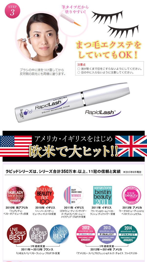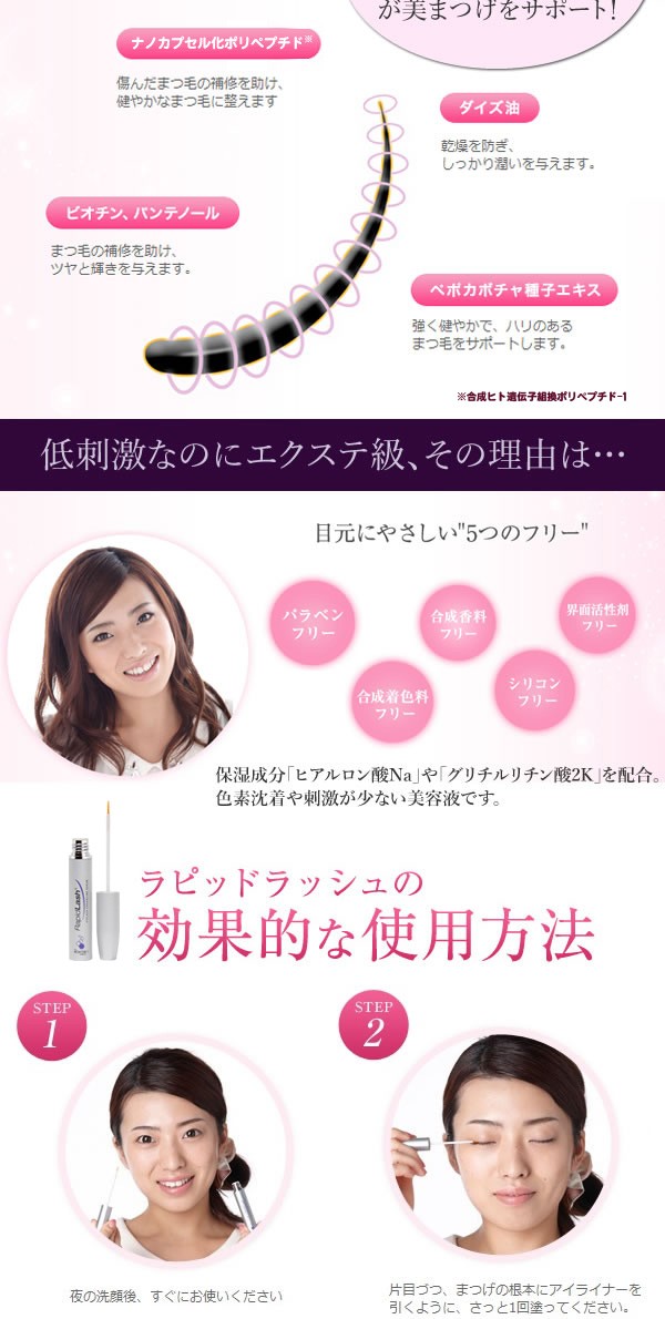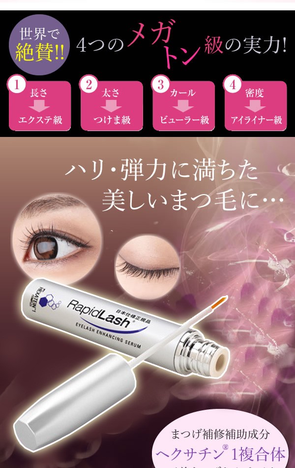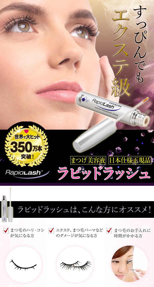 | 世界で350万本の売上を突破したまつげ美容液「ラピッドラッシュ」の日本正規品★まつげ補修補助成分が美まつげをサポートし、ハリ・弾力に満ちた美しいまつ毛に。アイライナー感覚で塗りやすく、まつエクをしていても使えちゃうのが嬉しい!! |