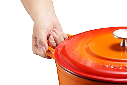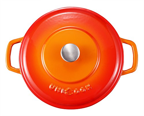 Product Description Unicook Dutch Oven is designed to enhance slow cooking through gentle, even heating, locking moisture for tender, succulent braises and stews. Though dutch ovens can appear in stainless steel or other materials, only cast iron dutch ovens work properly, enamel-coated cast iron as it will not only absorb, distribute, and retain heat evenly and efficiently but it's rust-proof and easy to wash to boot. The enamel coating makes the pot dishwasher-safe and freezer-safe, and it won't react with tomatoes or other acidic ingredients.