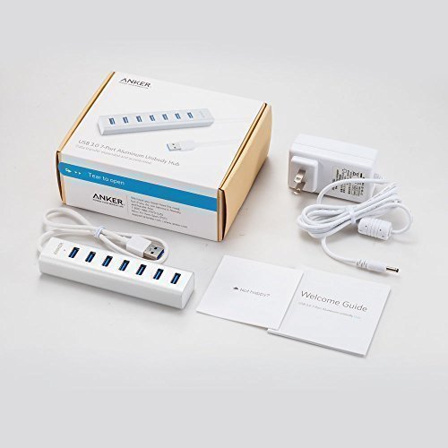 Package contents: Anker Unibody USB 3.0 7-Port Aluminum Hub with Built-in 1.3ft USB 3.0 cable, 5V / 3A power adapter with built-in 5ft cable, welcome guide, our fan-favorite 18-month warranty and friendly customer service.