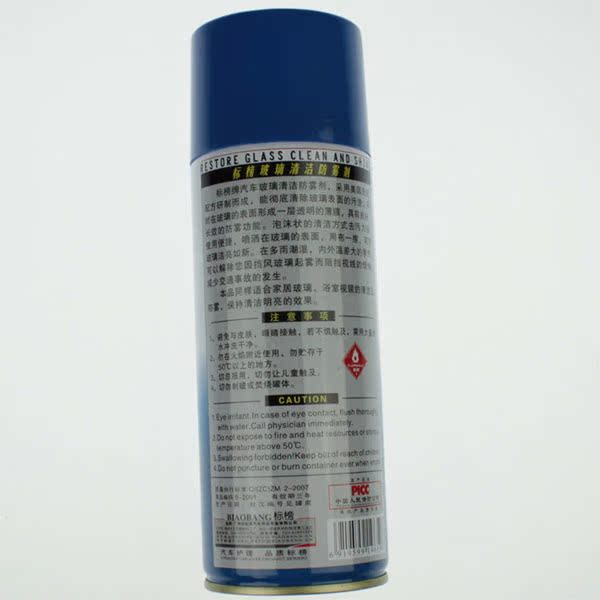 本产品采用美国先进配方研制而成,能彻底清除玻璃表面的污垢,同时形成一层透明的薄膜,具有良好长久的防雾功能.泡沫状的清洁方式去污力强,使用简捷.喷洒在玻璃的表面用布一擦,可使玻璃洁净如新.在多雨雪,内外温差大的季节,可以解除您因挡风玻璃起雾而阻挡视线的烦恼,减少交通事故的发生。 本产品同样适合家居玻璃,浴室镜子的清洁及防雾,保持清洁明亮的效果。