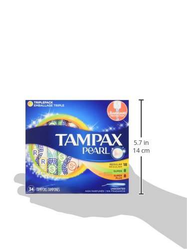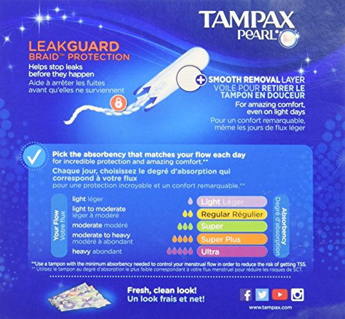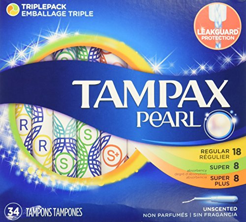 ReleaseDate : 2017-01-09 Studio : Procter Gamble - MF Publisher : Procter Gamble - MF Binding : Health and Beauty Product Description Get protection and comfort every time! only Tampax has a unique leak guard braid that helps stop leaks by channeling them back into the core, giving you ultimate protection, even on your heaviest days. The smooth removal layer gives you amazing comfort, even on your lightest days. Insertion of the tampon is always easy and comfortable with the smooth pearl applicator. Form fit protection helps close the gaps that can cause leaks, giving you up to 8 hours of protection. Plus, this triple pack of tampons has three levels of absorbency, so you're protected from your lighter days through your heavier ones. Feel confident with Tampax pearl, knowing that you get protection and comfort all day. 0