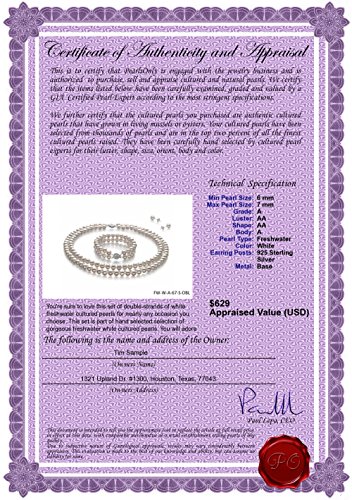 Included FREE with your cultured pearls set is an Appraisal Certificate prepared by a Pearl Expert describing in detail your set size, color and body shape. A color picture of your set is shown on each certificate to ensure carefree insurance claims should those ever arise. It is a wonderful keepsake that shows you truly care.