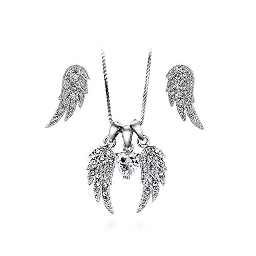 This 2-piece angel wings earrings and pendant necklace set's delicate design will inspire you to spread your wings and soar. Made of rhodium flashed base metal. Set with cubic zirconia and rhinestone. Earrings measure 0.88 inch in length, 0.38 inch in width. Posts with butterfly backs. Pendant measures 1.2 inch in length, 1 inch in width. Chain measures 18 inch in length. Lobster claw clasp. Imported.