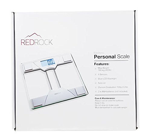 -. Binding : Health and Beauty -. Brand : Red Rock -. EAN : 0617529803649 -. Feature : Featuring Extra Large 3 x 1.5 inches LCD Blue backlight screen to make looking down at your measurements quick and easy. / Auto Step-On technology allows for this scale to be simple to use. Simply step on to the scale and it will automatically display precise weight measurement in increments of 0.2 lbs or 0.1 kg. When not in operation, this scale will automatically turns off to conserve battery / Made with 8mm tempered glass embodying the scale and impact resistant platform, as well as 4 precision sensors for high accuracy, this scale is built to last! / Included are free 2 x AAA batteries, your scale is ready to use out of the box. -. Label : Red Rock -. Manufacturer : Red Rock -. Model : PS9008H -. MPN : PS9008H -. PackageQuantity : 1 -. PartNumber : PS9008H -. ProductGroup : Home -. ProductTypeName : HEALTH_PERSONAL_CARE -. Publisher : Red Rock -. Studio : Red Rock -. Title : Red Rock Personal Body Weigh Scale Made with High Quality Tempered Glass Large Blue Backlight LCD -. UPC : 789629636325
