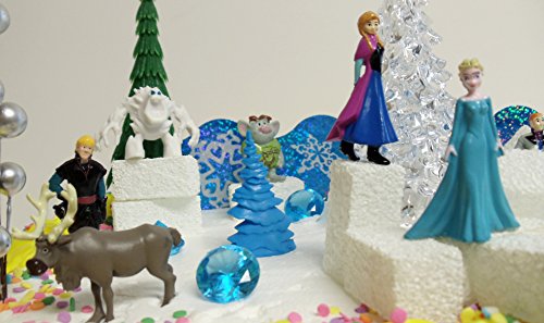Elsa and Anna Frozen 23 Piece Birthday Cake Topper Set Contrasting Spring Arendelle with Frozen Arendelle - Set Includes All Accessories Shown - Ice Cyrstals, Snow Flake, Trees, Rocks, and Backdrop along with Cake Topper Figures of Anna, Elsa, Hans, Kristoff, Sven & Olaf