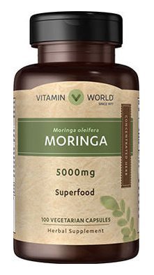 DESCRIPTION Moringa oleifera is one of the most nutrient-rich plants in the world and is often referred to as a powerful superfood. Naturally-dried Moringa leaves are a rich source of vitamins, minerals, amino acids, antioxidants and other potent phytochemicals.** Each capsule serving delivers 5000mg of Moringa per serving. Contains 100 vegetarian capsules. Read Less LABEL INFORMATION Supplement Facts Serving Size 1 Capsule Servings per container 100 Amount Per Serving Daily Value Moringa 5000mg ** (leaf) (Moringa oleifera) (from 100mg 50:1 extract) ** Daily Value not established. Directions: For adults, take one (1) capsule daily, preferably with a meal. Other Ingredients: Microcrystalline cellulose, modified cellulose (vegetarian capsule), vegetable stearate, silica. Warnings/Cautions: If you are pregnant, nursing, taking any medications or have any medical condition, consult your doctor before use. Discontinue use and consult your doctor if any adverse reactions occur. Keep out of reach of children. Store at room temperature. Do not use if seal under cap is broken or missing.