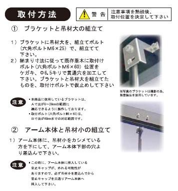 | セット内容 | アーム本体(58×510)×2 吊材大:L525×4 吊材小:L525×4 (組立部品) 固定ネジ:(直径4×10)×4 調整ネジ:(M4×10)×4 六角ボルト:(M6×25)×4 六角ナット:(M6用)×4 平座金:(M6用)×8 音止めキャップ:4 ブラケット:(63×44.5)×4 (取付け部品) 六角ボルト:(M6×60)×8 六角ナット:(M6用)×8 平座金:(M6用)×16 スプリング座金:(M6用)×8 取扱説明書 |