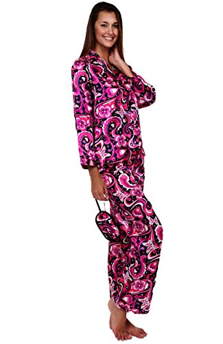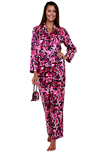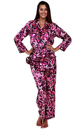 Del Rossa Women's Satin Pajamas, Long Button-Down Pj Set and Mask, Small 70s Pink on Black (A0750P92SM)