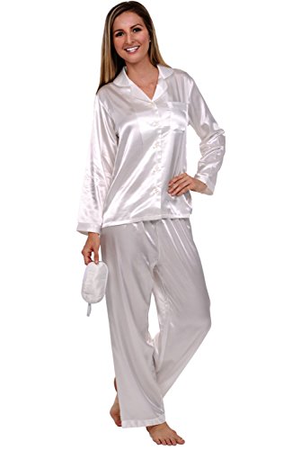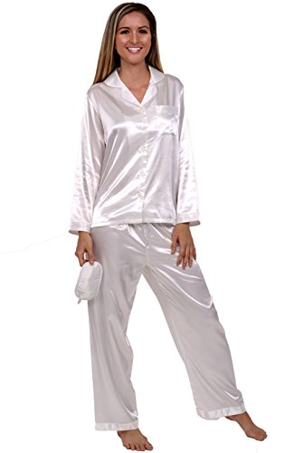 Del Rossa Women's Satin Pajamas, Long Button-Down Pj Set and Mask, Small Pearl White (A0750CRMSM)