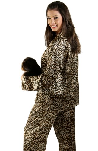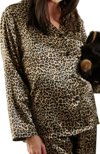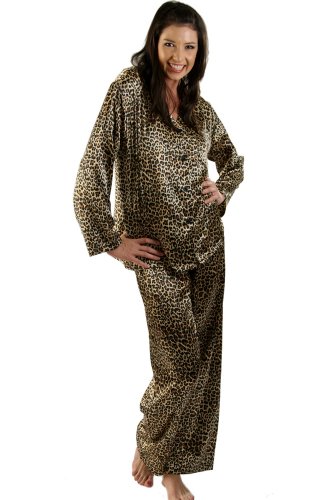 Del Rossa Women's Satin Pajamas, Long Button-Down Pj Set and Mask, Medium Tan Leopard (A0750P04MD)