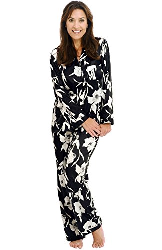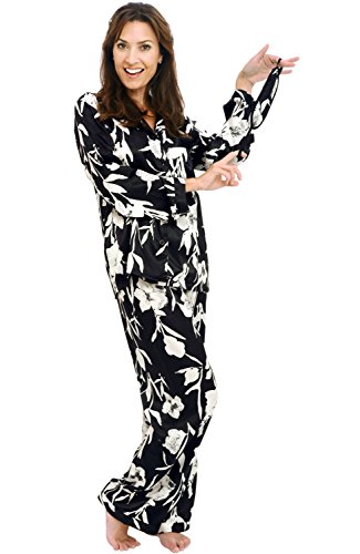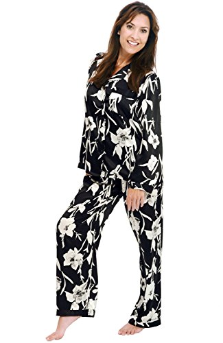 Del Rossa Women's Satin Pajamas, Long Button-Down Pj Set and Mask, Medium Black Floral Print (A0750P60MD)