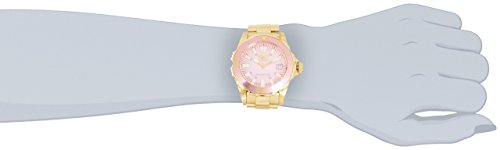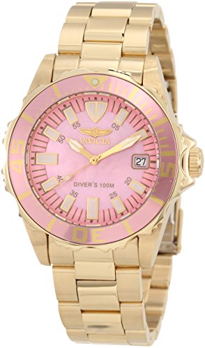 Gold-plated stainless steel case and bracelet. Uni-directional rotating gold-plated bezel with pink top. Pink mother of pearl dial with luminous gold-tone hands and index hour markers. Minute markers around the outer rim. Dial Type: Analog. Luminescent hands and markers. Date display at the 3 o'clock position. Quartz movement. Scratch resistant mineral crystal. Pull / push crown. Solid case back. Case diameter: 41.5 mm. Case thickness: 11 mm. Round case shape. Band width: 20 mm. Band length: 8 inches. Fold over clasp with safety release. Water resistant at 100 meters / 330 feet. Functions: date, hour, minute, second. Casual watch style. Invicta Pro Diver Pink Mother of Pearl Gold-plated Ladies Watch 10624.Feature