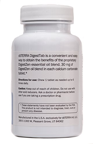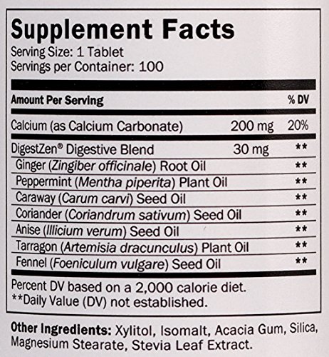 -. Feature : When digestive issues or occasional stomach upsets arise, DigestTab provides the benefits of DigestZen Digestive Blend in a convenient and chewable tablet / Specifically designed for individuals with sensitive stomachs / Combines the unique digestive benefits of calcium carbonate along with pure essential oils from plants traditionally known for providing soothing support to the gastrointestinal tract, including Ginger, Peppermint, Caraway, Coriander, and Anise / A unique and powerful synergistic blend of natural ingredients designed to relieve occasional heartburn and indigestion, while promoting the overall health of the gastrointestinal tract. / Helps relieve occasional sour stomach and provides relief from the uncomfortable burning of occasional acid indigestion and helps reduce unwanted belching and bloating