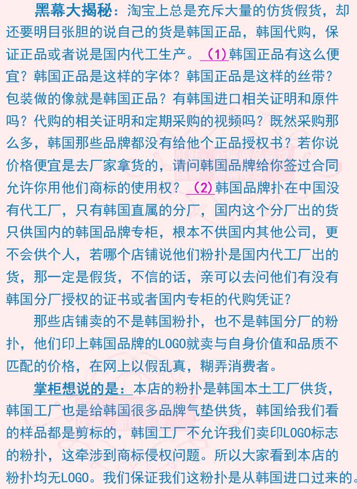 答:其他店铺写的是进口品质,或者进口材质,亲要搞清楚什么是100%韩国进口,什么是进口材质。100%韩国进口是在韩国生产,韩国空运发过来,我们有韩国过来的空运物流凭证原件。其他店铺写的是进口品质,或者进口材质,进口材质并不是韩国生产的材质,而他们的材质是国内厂家做的,他们并没有任何进口凭证。