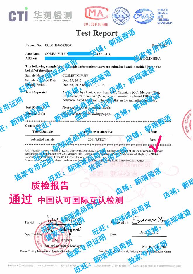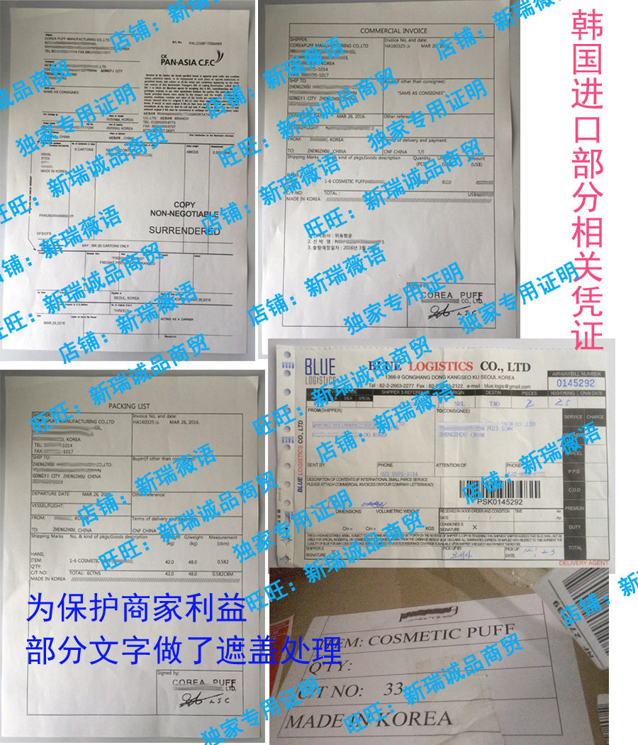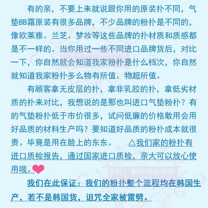 1)本粉扑在韩国原厂生产,有进出口相关凭证原件,有进出口商务发货票,有进口质检报告,通过国家进口检测。