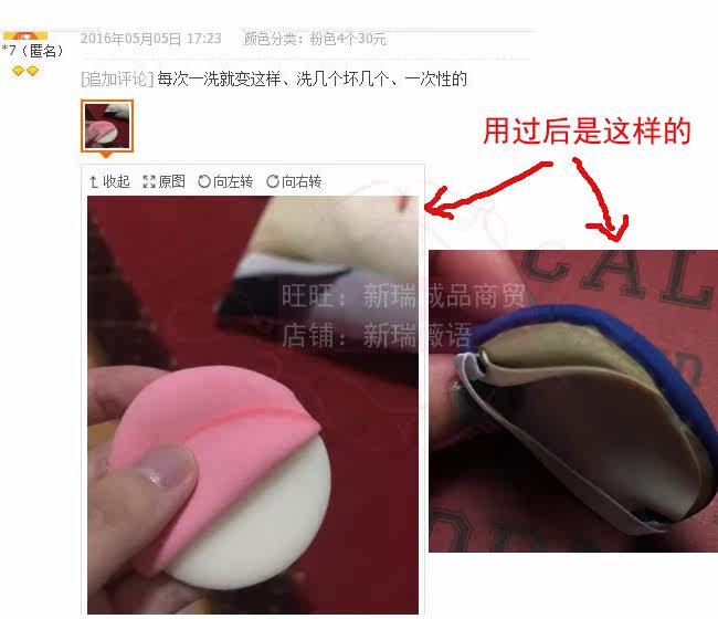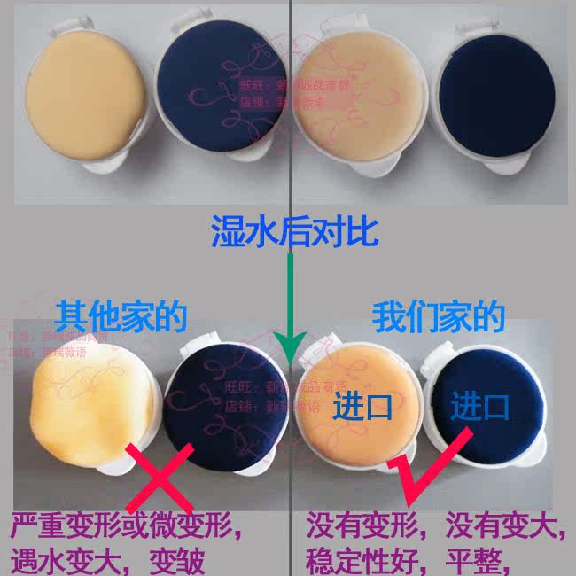 经测试:泡水3个月不变大,不变形,不开裂,正常使用3个月不掉渣。材质柔软,细腻,有弹性,上妆效果好,服帖均匀,吸粉相对较少。