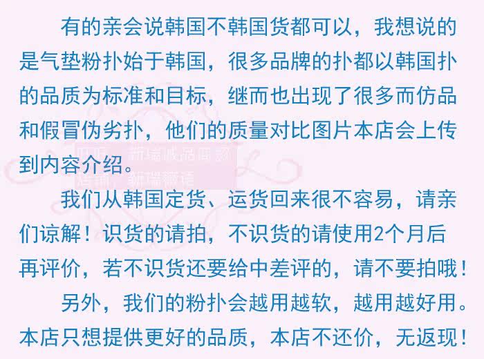 属于多品牌通用替换扑。气垫有很多品牌,有不少品牌的扑都是不同的,我们不保证和你用的是1个品牌,我们只保证我们这扑是韩国生产,韩国进口过来的。