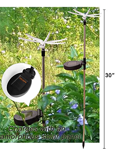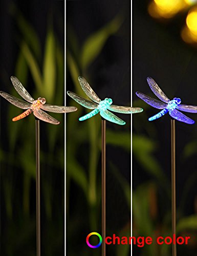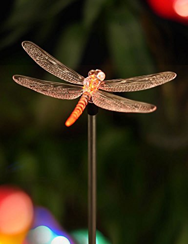 - EYE-CATCHING SOLAR COLOR-CHANGING GARDEN STAKE LIGHT, DAY AND NIGHT - LED garden stake light with vivid DRAGONFLY figurine - At night, Bright LED of multiple alternating colors (blue, green, orange, rose) automatically illuminates with a full charge in the sun - The solar changing light show will mesmerize you as you watch the starburst shine through its bodies - Adds warm and charming atmosphere in any season, making your yard outstanding from neighbors