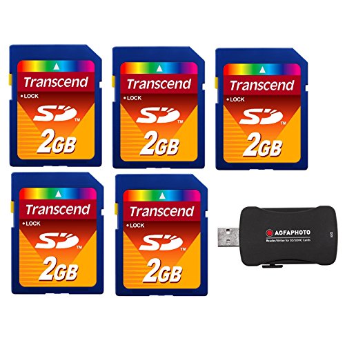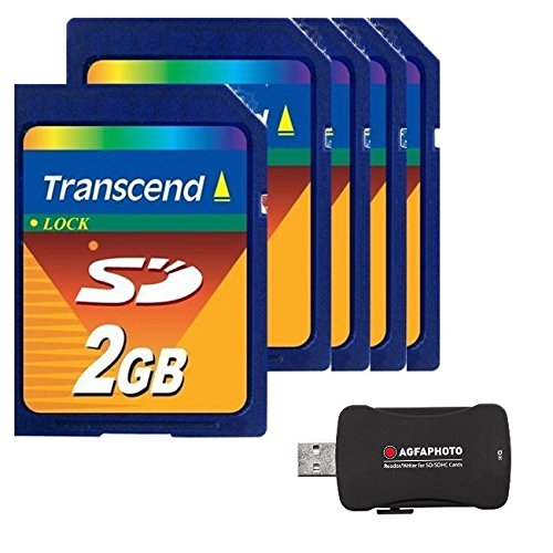 LOT of 5 Transcend 2gb SD memory card for Canon EOS 70D 60D 6D 5D EOS 7D Mark II Rebel T6i T6S T5i T5 T4i T3i T3 SL1 XSi DSLR Cameras with bonus Agfa SD Card Reader