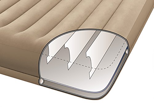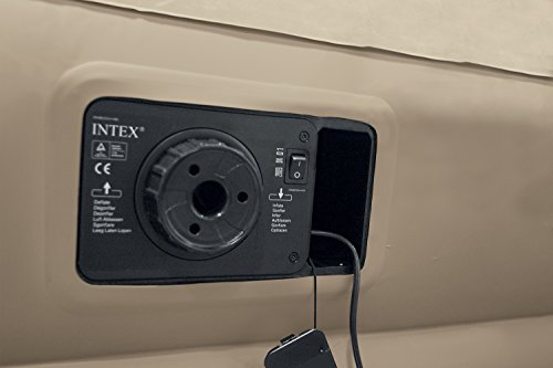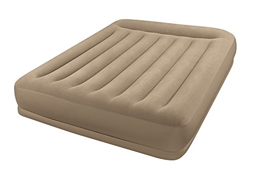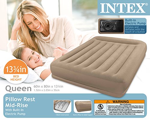 -. Binding : Sports -. Brand : Intex -. ClothingSize : 60" x 80" x 15" -. Color : Biege -. Department : unisex-adult -. EAN : 0078257315666 -. Feature : Inflatable Queen airbed with built-in electric pump for home use; includes built-in pillows / Waterproof flocked top with vinyl beams and sturdy construction / High-powered pump inflates mattress in approximately 3 minutes / Raised 13.5 inches from floor; built-in pillows for added comfort / Measures 60 by 13.5 by 80 inches (WxHxD); 600-pound weight capacity / Location, temperature, and humidity will affect the airbed's firmness. Airbeds will need to be occasionally re-inflated (topped off) to maintain desired firmness when used for more than a few days as vinyl tends to relax over time. / Measurements will vary based on customer's inflation. Airbeds are measured from the widest point including the beams (bulges) on the side and off the tallest point from the floor including built-in pillows if applicable. -. IsAutographed : 0 -. IsMemorabilia : 0 -. Label : INTEX -. Manufacturer : INTEX -. Model : 67747E -. MPN : 67747E -. PackageQuantity : 1 -. PartNumber : 67747E -. ProductGroup : Sports -. ProductTypeName : OUTDOOR_RECREATION_PRODUCT -. Publisher : INTEX -. Size : 60"x80"x15" -. Studio : INTEX -. Title : Intex Pillow Rest Mid-Rise Airbed with Built-in Pillow and Electric Pump, Queen, Bed Height 13 3/4" -. UPC : 078257677474 -. Warranty : 30-day warranty