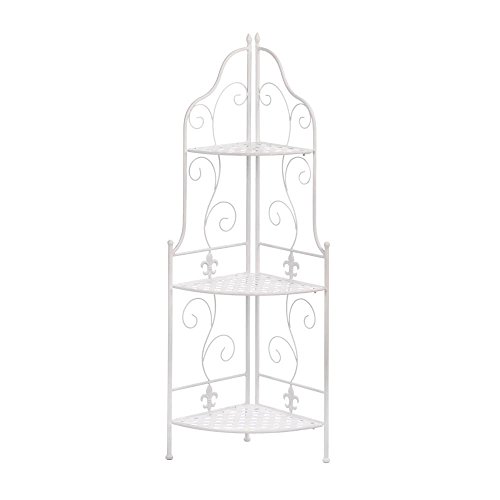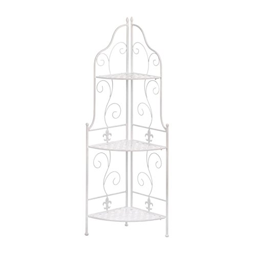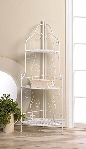 Studio : Koehlerhomedecor Publisher : Koehlerhomedecor Product Description Bring big style to any little corner! This charming corner unit features three basket weave shelves, scrolling flourishes, and fleur-de-lis accents. It's perfect for displaying your collection of keepsakes or your blooming green plants. Item Weight 11.6 pounds. Dimensions: 17.8" x 12.6" x 46". Material: Iron. 0