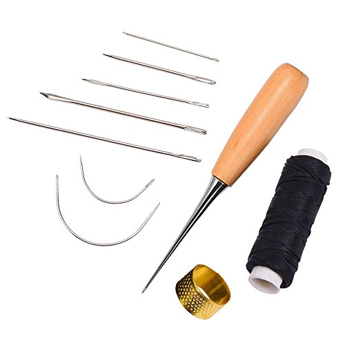 Outus 7 Pieces Sewing Needles with Leather Waxed Thread Cord Drilling Awl and Thimble for Leather Repair