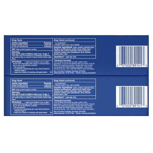 ActiveIngredient:SodiumFluoride0.243%AnticavityToothpasteInactiveIngredients:Water,Sorbitol,HydratedSilica,DisodiumPyrophosphate,SodiumLaurylSulfate,Flavor,CelluloseGum,SodiumHydroxide,SodiumSaccharin,Mica,Polyethylene,Carbomer,XanthanGum,TitaniumDioxide,Blue1Lake