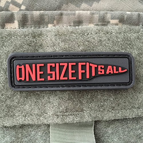 - HIGH QUALITY PVC MORALE PATCH featuring One Size Fits All printed on bullet. Hook velcro sewn on back so can easily be applied to any loop velcro surface. Not glued! Patch is extremely durable and cleans easily with warm water and soap.