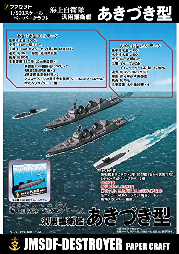 -. Feature : 海上自衛隊「護衛艦あきづき型」を1/900スケールでペーパークラフトキットにしました。 潜水艦おやしお型<特別収録> / 本品で、あきづき型の護衛艦が2隻が作れます。ヘリや潜水艦も付属してジオラマ感満載です。 (1/900スケール)他の護衛艦もそろえて艦隊をつくろう! / 詳細な絵入れを施してありますので、「塗装が苦手」、「接着剤の臭いが・・・」と言う模型女子にも気軽に挑戦できる新しい模型のジャンルです。 / 作成時間:2~4時間(1隻あたり。個人差あります。) 対象年齢:中学生以上(器用な方にお勧め!) / 商品仕様:A4上質紙 5枚(部品図4枚含む) / 注意:本品は精密な紙模型につき、切り込み加工は施していません!