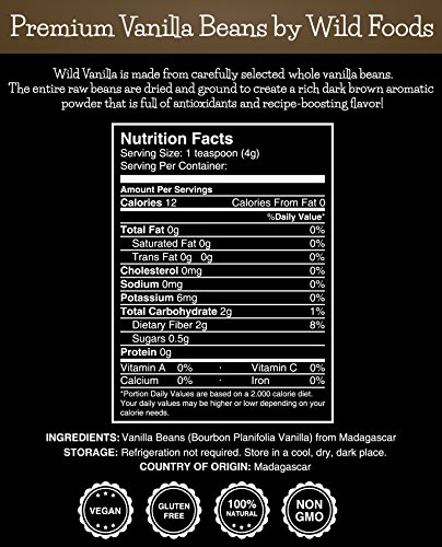 - 100% RAW AND SINGLE-ORIGIN VANILLA BEAN POWDER FROM MADAGASCAR! Non-GMO, Chemical and fertilizer-free, Vegan and Paleo; Just a few reasons why Wild Vanilla is superior to the mass-produced, low quality vanilla products that comprise the bulk of the market.