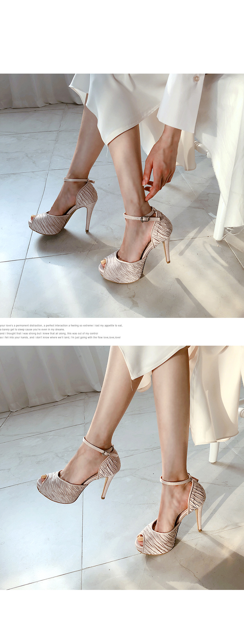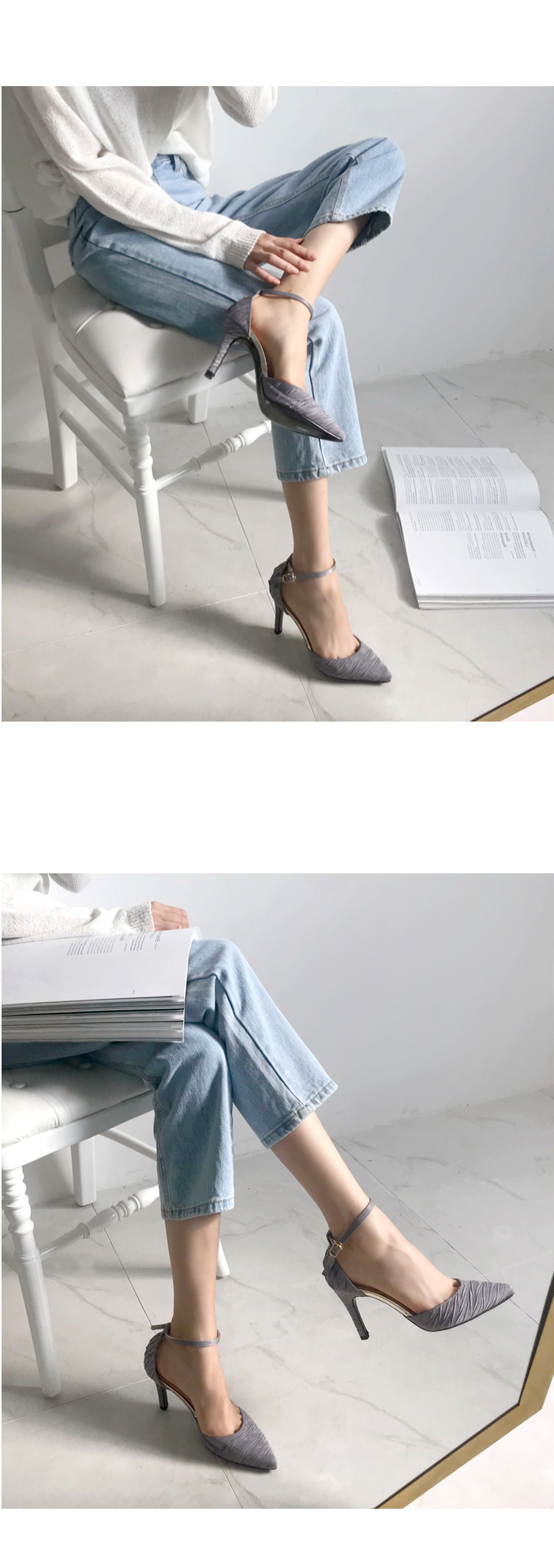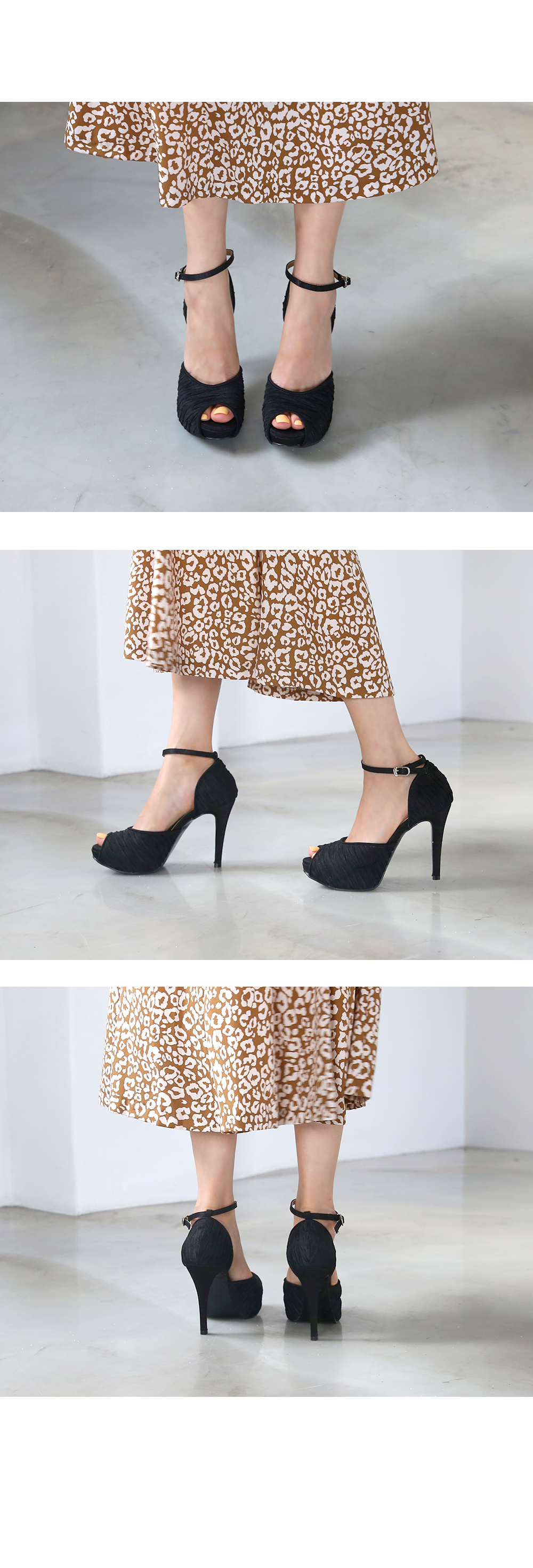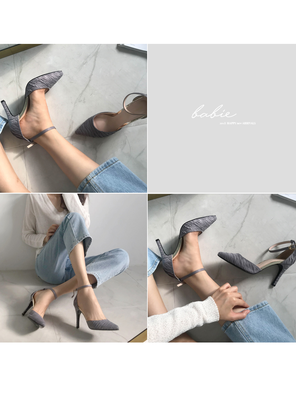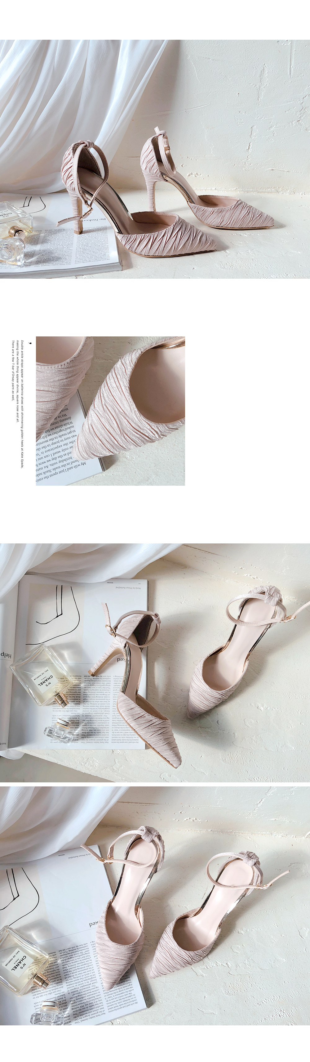 DETAILS - 소재 : 새틴 - 컬러 : beige,gray,black - 피팅감 : 정사이즈 / 무게 : 보통인편 - 착화감 : 정사이즈로 편하게 신을 수 있어요 - 모델피팅 : 235