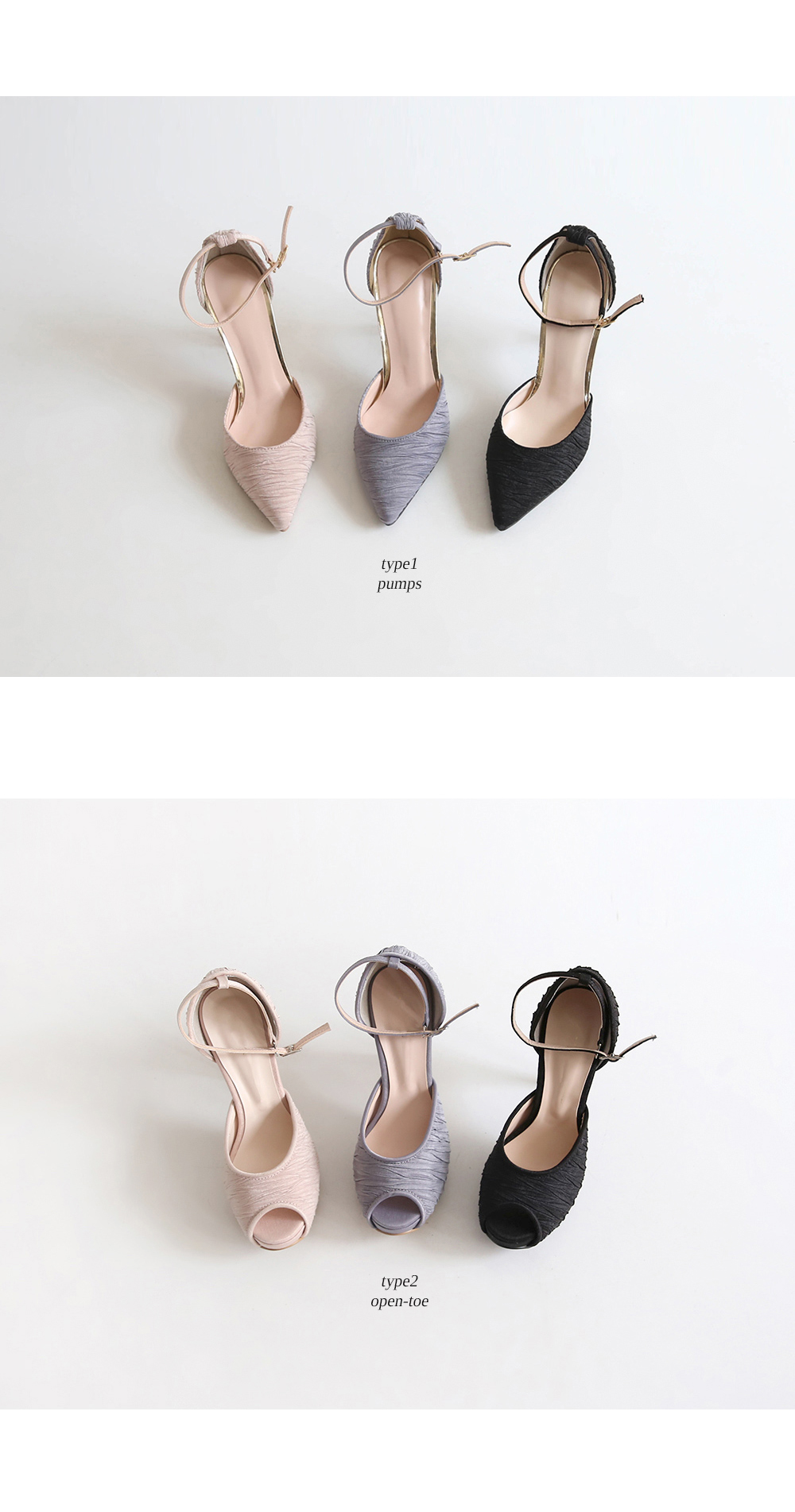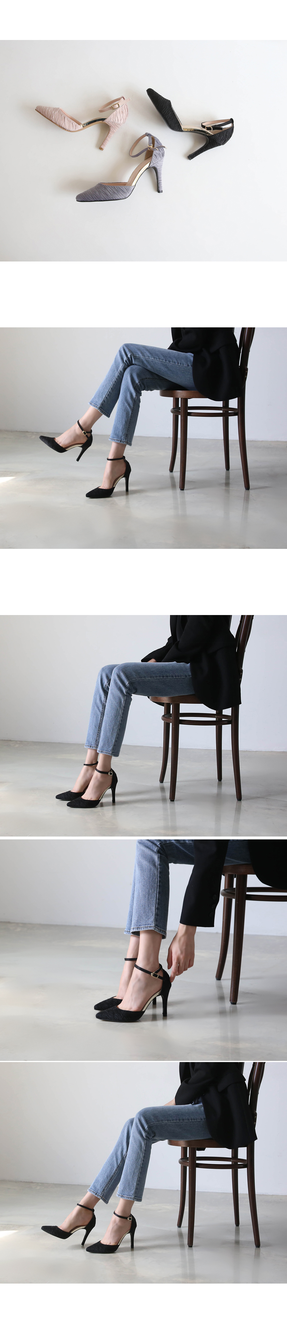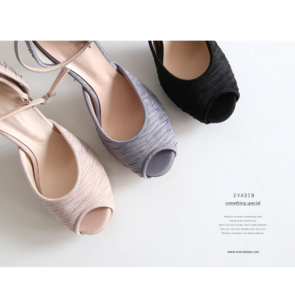 터치감이 살아있는 새틴소재로 디자인된 킬힐입니다. 두가지의 차분한 톤의 컬러와 베이직한 블랙 컬러로 구성되었습니다.