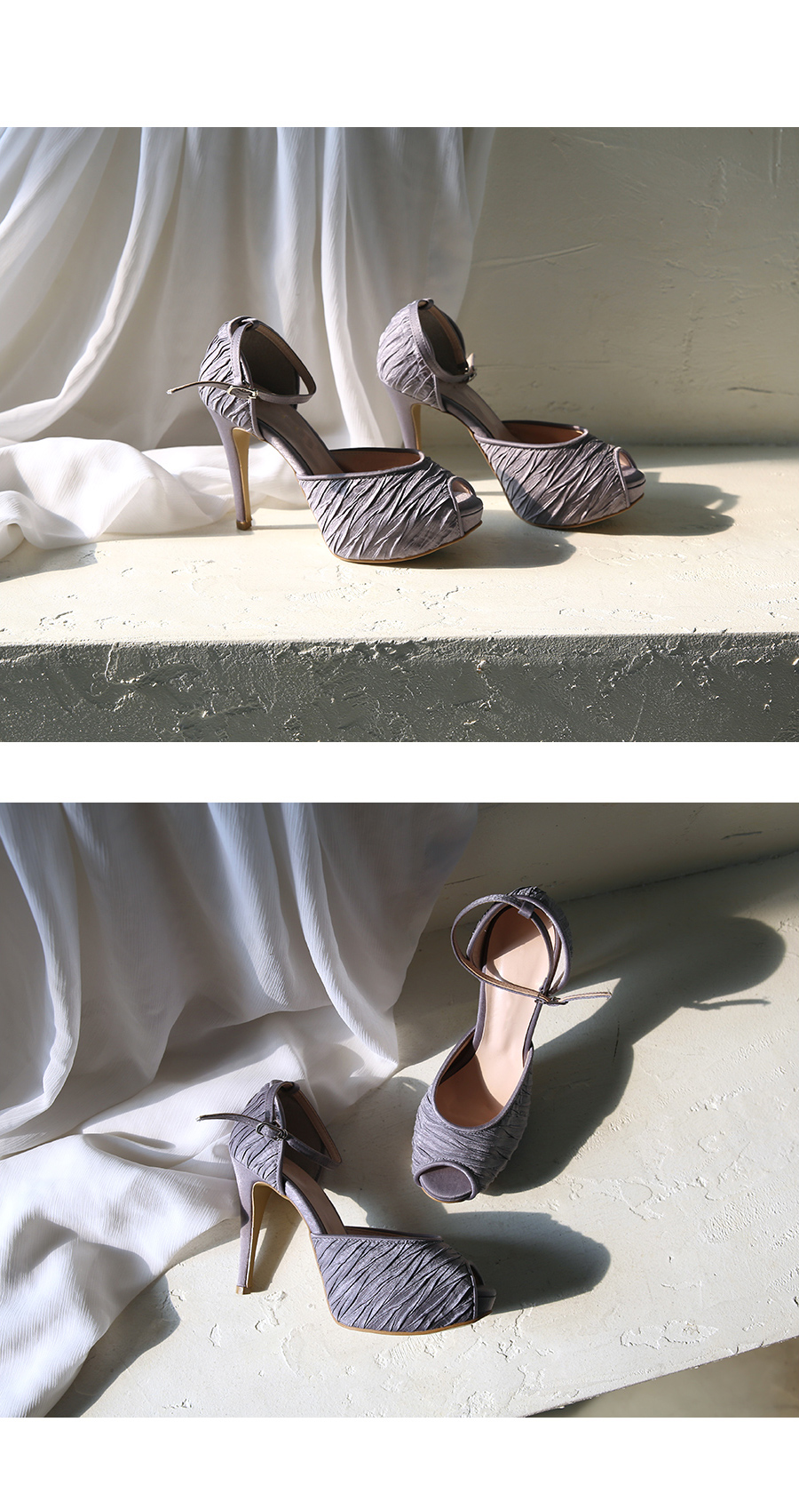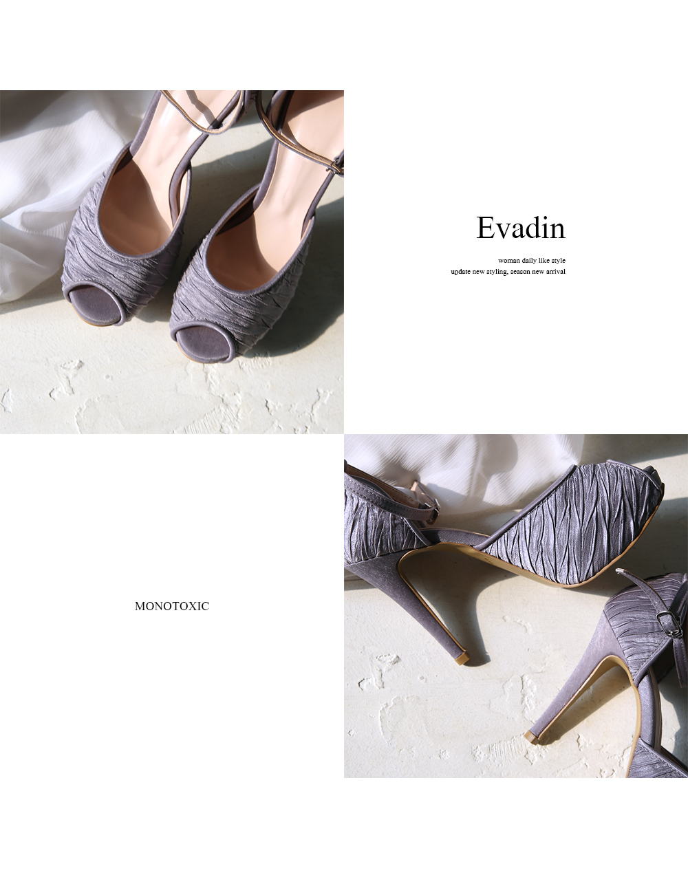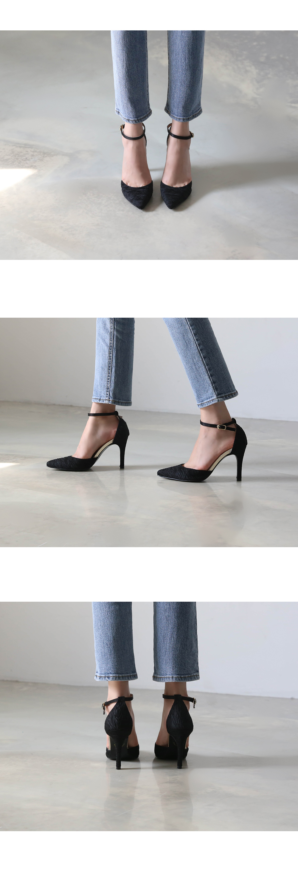 터치감이 살아있는 새틴소재로 디자인된 킬힐입니다. 두가지의 차분한 톤의 컬러와 베이직한 블랙 컬러로 구성되었습니다.