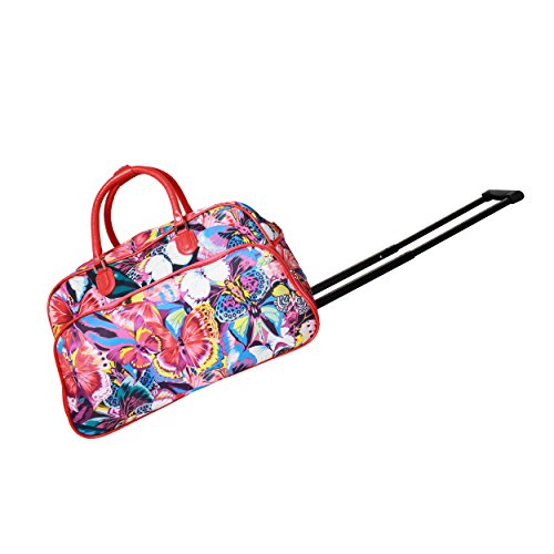 -. Binding : Apparel -. Brand : World Traveler -. Feature : Front zipper secured pocket and interior pockets for organization / EVA Polyester construction, top zipper opening / Adjustable ergonomic shoulder strap, internal retractable handle system, in-line skate wheels / Dimensions: 12 in H x 11 in W x 21 in L - 4.8 lb / 21x11x12 -. Label : World Traveler -. Manufacturer : World Traveler -. PackageQuantity : 1 -. ProductGroup : Apparel -. ProductTypeName : BAG -. Publisher : World Traveler -. Studio : World Traveler -. Title : World Traveler Butterfly Tattoo 21" Rolling Duffel Bag - Pink Trim Butterfly Rolling Duffel