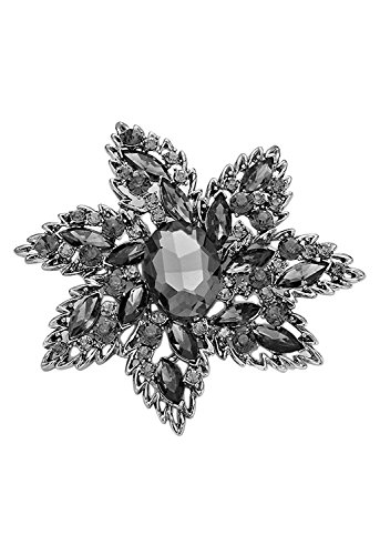 -. Feature : Beautiful large flower design silver tone fashion brooch / Stunning black diamond color faceted rhinestones in varying shapes / Size: 3.75" width 3.75" length, Locking bar pin with safety latch clasp / Great accessory to accent your sweater, scarf, coat or handbag / Packaged in a lovely gift box