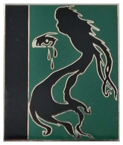 - This pin features a black silhouette of a mermaid. Next to the mermaid is an eye with a tear streaming down