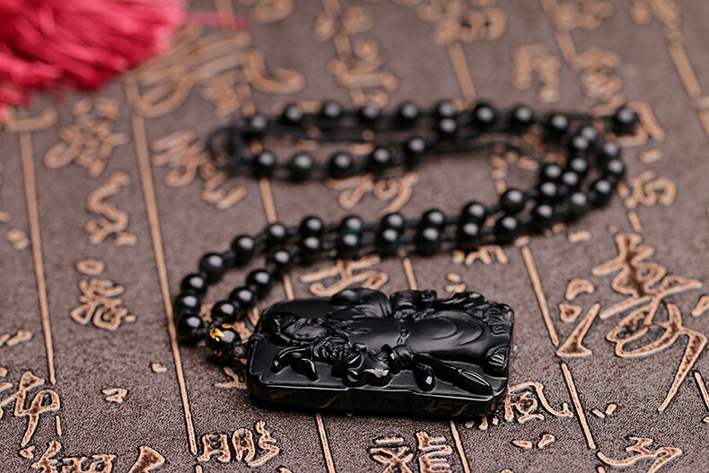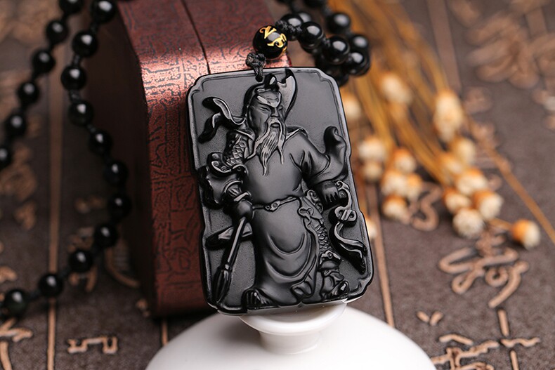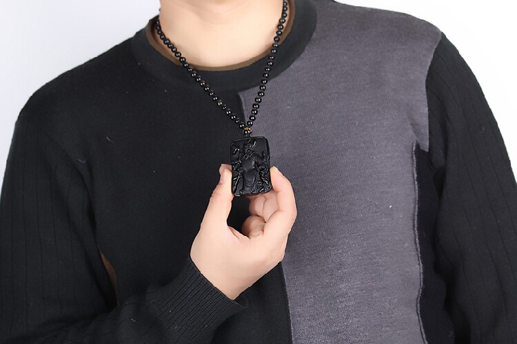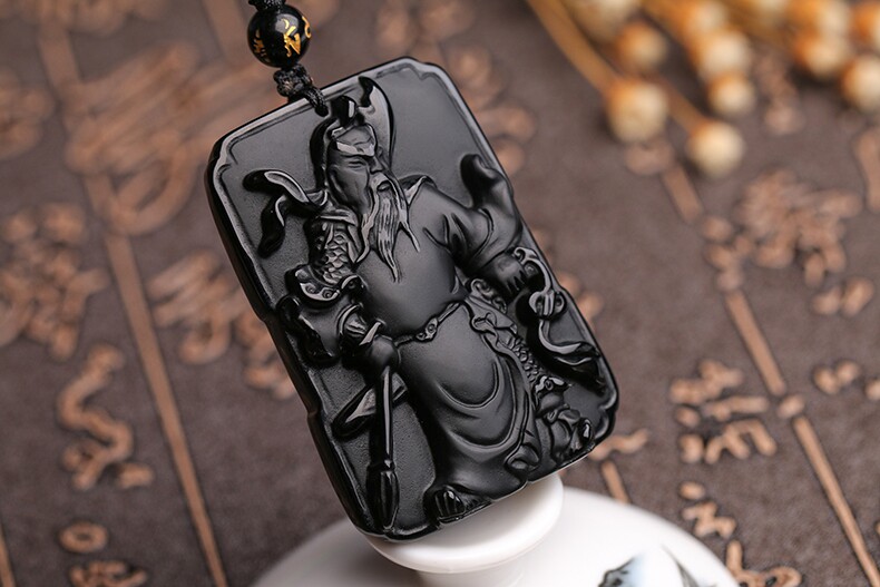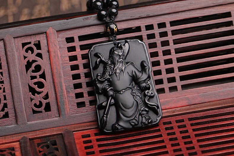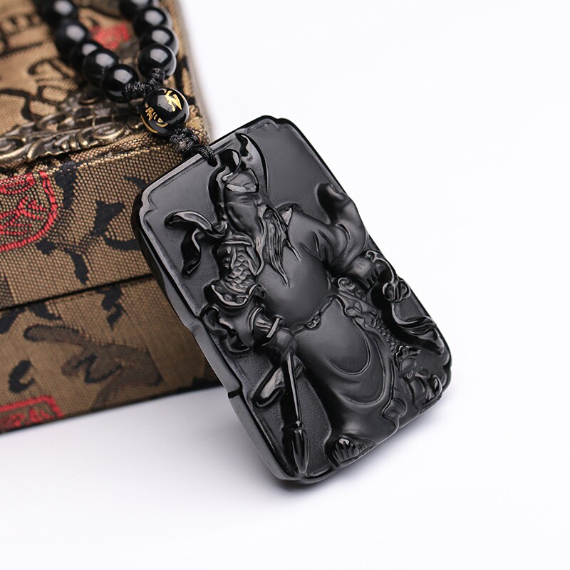 天然黑曜石关公吊坠 男士项链 开光武财神水晶项链饰品礼物