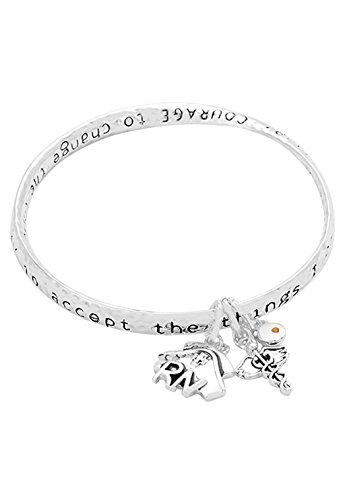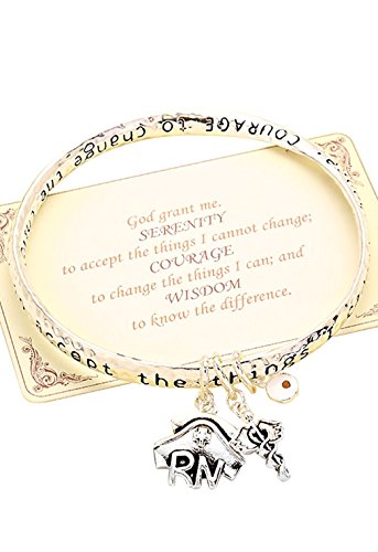 -. Binding : Jewelry -. Brand : Rosemarie Collections -. Department : womens -. Feature : Inscription reads "God grant me serenity to accept the things I cannot change; Courage to change the things I can; and wisdom to know the difference" / Charms include nurse cap with "RN" and caduceus symbol / 2.5 inch diameter opening, fits small to medium wrists / Silver tone twist bangle bracelet / Packaged in a lovely gift box -. Model : SW- 9573-7XXX -. MPN : SW- 9573-7XXX -. PartNumber : SW- 9573-7XXX -. ProductGroup : Jewelry -. ProductTypeName : FASHIONNECKLACEBRACELETANKLET -. Title : Rosemarie Collections Women's Serenity Prayer Nurse Appreciation Bangle Bracelet