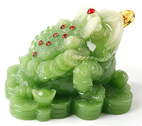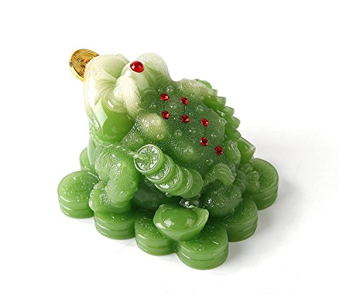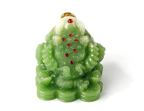 Feng Shui Green Color Money Frog (Three Legged Wealth Frog or Money Toad) Statue Car Dashboard Decoration + Free Set of 10 Lucky Charm Ancient Coins on Red String, Attract Wealth and Good Luck
