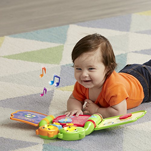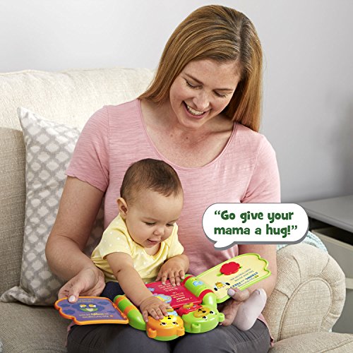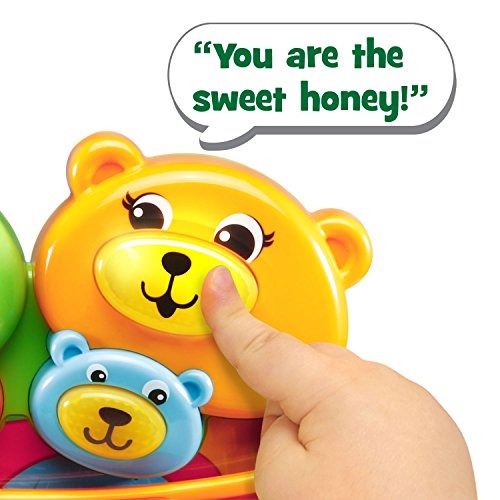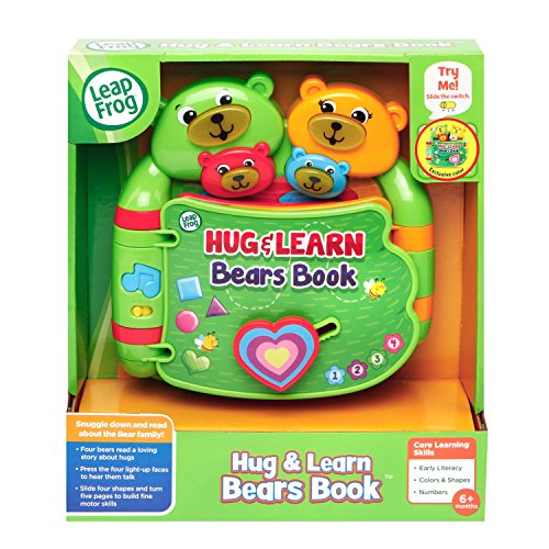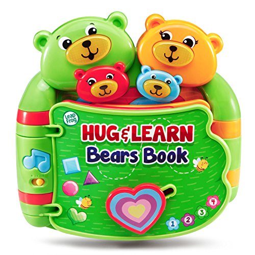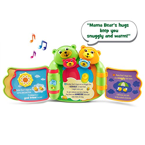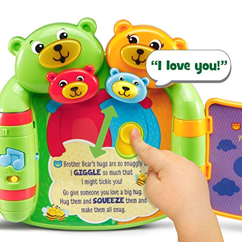 Snuggle up with your little one as you read the Hug and Learn Bears Book. This adorable, interactive book introduces early language skills to pre-readers. Full of family love and big bear hugs, the six-page story teaches numbers, shapes and colors. Listen to music and sweet sounds as you turn the pages. Press the four light-up faces to hear phrases from each bear, encouraging lots of love and hugs. Enjoy lights and music while developing fine motor skills by turning the pages, sliding the heart and twisting the butterfly. Tickle Brother Bear at the end of the book to hear him giggle! Bears book is intended for toddler ages 6 months to 3 years old. 2AA batteries are included for demo purposes, replace new batteries for regular use. Product Dimensions: 8.2W x 7.9H x 2.6D.Feature
