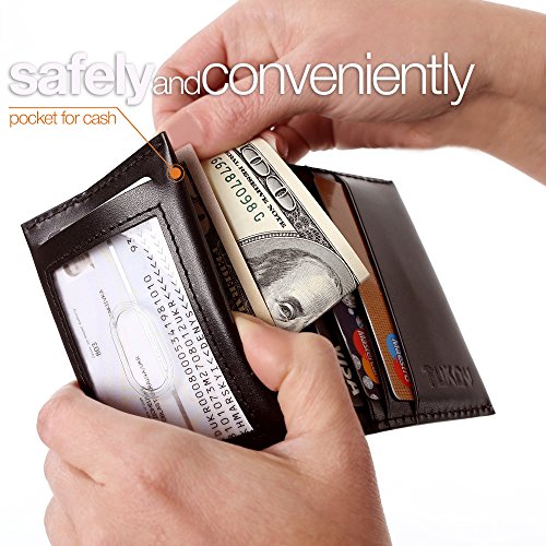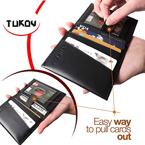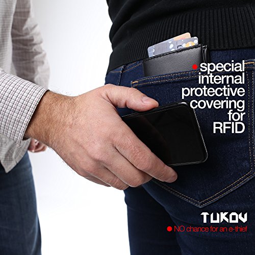 What men want in a wallet? Quality materials and construction for durability. For those who prefer carrying their wallet in a pocket (pants, jeans, shorts, shirts and so on), we offer the thin and most practical and functional of all compact wallets. Our minimalist wallets for men are crafted using premium full-grain leather, the best grade of leather available. This leather will only get more beautiful with use and actually improves with age. Quick access to credit cards and cash. Our small wallet holds from 4 to 9 cards and has a convenient ID window. Behind the ID window is a cash stash pocket that's safe and easy to access (can hold from 1 to 12 bills). This is enough for everyday use. Smart pull tab for quick access to deep pocket with credit cards without having to dig. An RFID blocking protection system is inserted into our leather bifold wallet in order to protect your credit cards and ID from unsanctioned scanning aimed at stealing your personal data. You can rest assured that the anti-theft protection acts reliably and your personal data is safe. Style that's simple and classic. If you got used to keeping a slim bifold wallet in a pocket, then a rfid wallet is exactly what you need. This mens minimalist wallet is perfect for holding business cards, debit and credit cards, driver's license, other identifications, and cash. Every wallet is built to last and comes with a one year no hassle warranty. If you aren't satisfied, reach out to our customer service and we'll do what it takes to make it right! Order the TUKOV Leather Wallet with RFID Blocking right now! 0