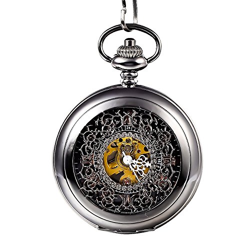 -. Title : Steampunk Mechanical Style Skeleton Tungsten Steel Windup Mens Pocket Watch Roman Numerals Scale