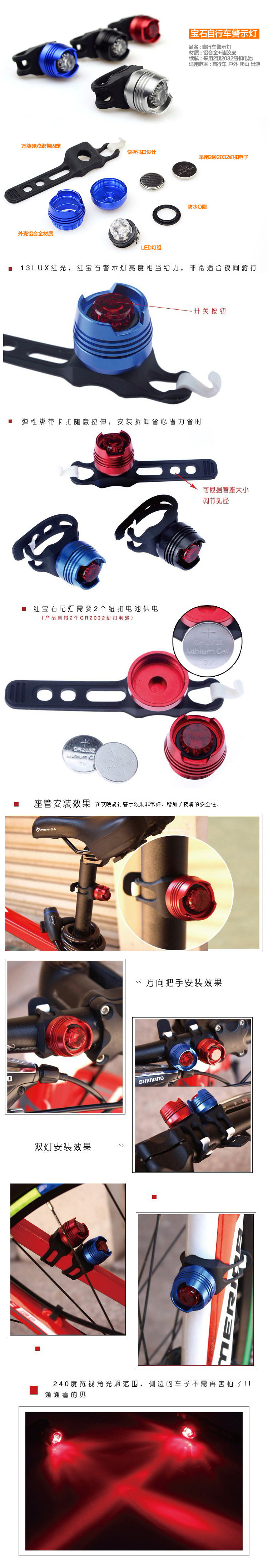 Light mode: Always / flash storm Life: two 2032 batteries (the product has a battery installed) Material: Aluminum alloy shell + soft plastic silicone clip made in China Introduction ◆ use of aluminum + highly flexible waterproof silicone material ◆ solid, durable, stretch strong tension ◆ multi-function fixed way ◆ 2 kinds of switching mode ◆ anti-water anti-leaching design - not afraid of flooding rainy days ◆ Install or remove without tools for 3 seconds to get ◆ Australian fashion design ● Silicone material is cold and heat-resistant, safe to use even when the temperature is minus 40 degrees or 220 degrees. ● Outer layers are coated with high elasticity waterproof silicone, stable, durable, stretching tension. ● High elastic silicone multi-function fixing method - can be installed on the handlebar, cushion standpipe, front fork, fork, backpack, helmet ... use. ● fixed in front of safety helmet - night riding can be used when warning headlights and browsing maps. ● Fixed to the rear of the helmet - Can be used as a warning taillight. ● One-Touch switch design, easy to operate. ● 3 kinds of switching methods: all bright, flashing 1, flashing 2, off, according to your actual needs quickly switch. ● full light sustainable use of 35 hours. ● Blinking lasts for 160 hours. ● effective warning visibility up to 600 meters above. ● Fast-release design - install or remove without tools for 3 seconds to get. ● emergency lighting, outdoor play at night, mountaineering lighting, bicycle lighting are suitable. ● Waterproof anti-leaching design - rainy days are not afraid of flooding. PS: It is recommended to buy 2 or more white (when the warning headlights) + red (when the warning taillights) with the use of lights.