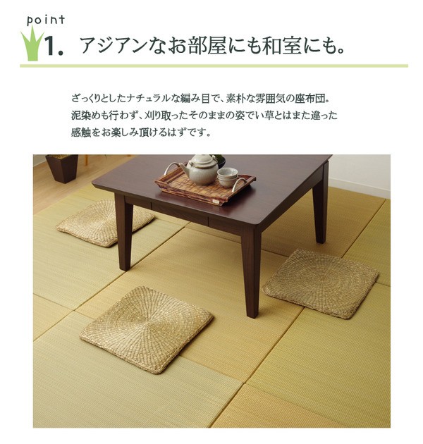 ベトナムの太陽の下で元気に育った七島イ草を使用しています。七島イ草はベトナムでとれる草の一種で、日本のイ草によく似た効能を持ち合わせています。特長として1.空気の清浄力(空気汚染の原因や人間の健康に悪影響を及ぼしているホルムアルデヒド、二酸化窒素を吸収します。)2.耐久性があります。肌触りは自然素材ならではの「ざっくり感」、座り心地は「ふんわり」です。中材にはウレタンを使用していますので不思議な快適さを感じることができます。置くだけで雰囲気の出る七島イ草は家のリビングに、お店(居酒屋、和風の飲食店など)に、簡単にイメージ通りの空間にするお手伝いをしてくれます。一つ一つ丁寧に編み込んでいますので、しっかりしていて丈夫です。※自然素材であること、また職人が一つ一つ手作業にて加工を行うため、形状のバラつきや表示サイズと多少異なることがあります。ご了承下さい。