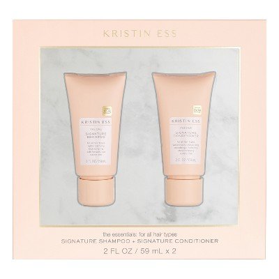 Kristin Ess Signature Shampoo + Signature Hair Conditioner Set contains 1 two oz. shampoo and 1 two oz. conditioner.