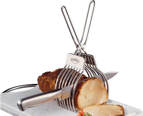 Slice roasts, loins, and other meats with confidence while using our roast cutting tongs. Simply grasp the roast with this holder and cut in between for even slices- and no mess. Made entirely of stainless steel for a lifetime of use, these tongs Keep sharp knifes away from your fingers for safe and convenient slicing.