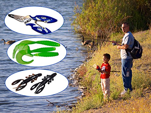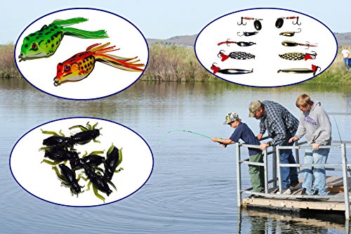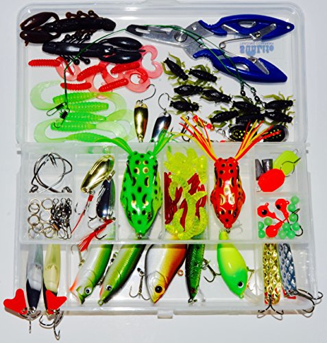 -. Feature : EVERYTHING YOU NEED TO LAND THE BIG ONE - Our Sun Life fishing tackle set has a full complement of bright hard lures, top water frogs, colorful and soft rubber worms, shrimp, crawfish and crickets soft baits and sharp single and treble hooks that will help you bring in the biggest catch. / GREAT GIFT IDEA - There's something for every angler no matter the skill level in this unique set. The small tackle box size lets even the littlest fishermen carry their own gear to the lake or riverside. Your favorite expert fisherman will enjoy the wide variety of different baits to add to his regular tackle. If your son, daughter, niece, nephew or grandkids are hunting for any type of fish: bass, trout, crappie or walleye, this is the lure set for the perfect gift! / LARGE HARD LURES AND SPINNER BAITS FOR BIGGER FISH - Largemouth and smallmouth bass, walleye and pike will hit the five included life-like crankbait lures with reckless abandon. The quality of these crankbaits with rattle-sound producing bearings is worth the P.R.Ice of the entire set alone. Six bright, shiny and reflective spinnerbaits are sure to attract all the biggest catches. These baits imitate the food the fish eat in the wild, so it's easier to reel in your trophy fish. / JIGS, GRUBS FOR PANFISH - Bluegill, sunfish, crappie warmouth and perch will be no match for our 30+ small baits and jigs. The special tiny spoons and soft baits are also perfect for this winter's ice fishing expeditions. No matter the type of fish you are casting for to put in the pan for tonight's dinner over a campfire or at home on the stove, this is the set for you. / COMBO FISHERMAN'S PLIERS/LINE CUTTER - An added set of fisherman's pliers/line cutter will make retrieving the hook from your trophy fish a snap so you can take your celebration selfie immediately and get back to fishing.