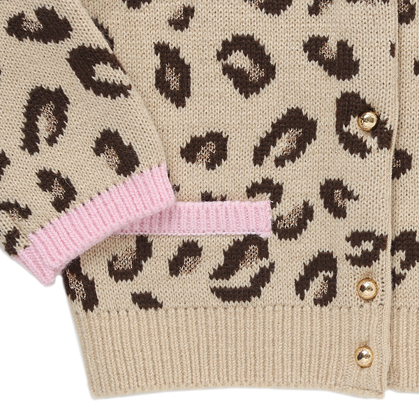 상품설명 호피 자가드 가디건입니다. 이중지로 살짝 도톰한 두께구요. 넥라인과 소매밑단. 핑크 장식 포켓에 들어간 핑크 배색으로 사랑스러움을 더했습니다. 로고가 들어간 골드단추 여밈입니다.
